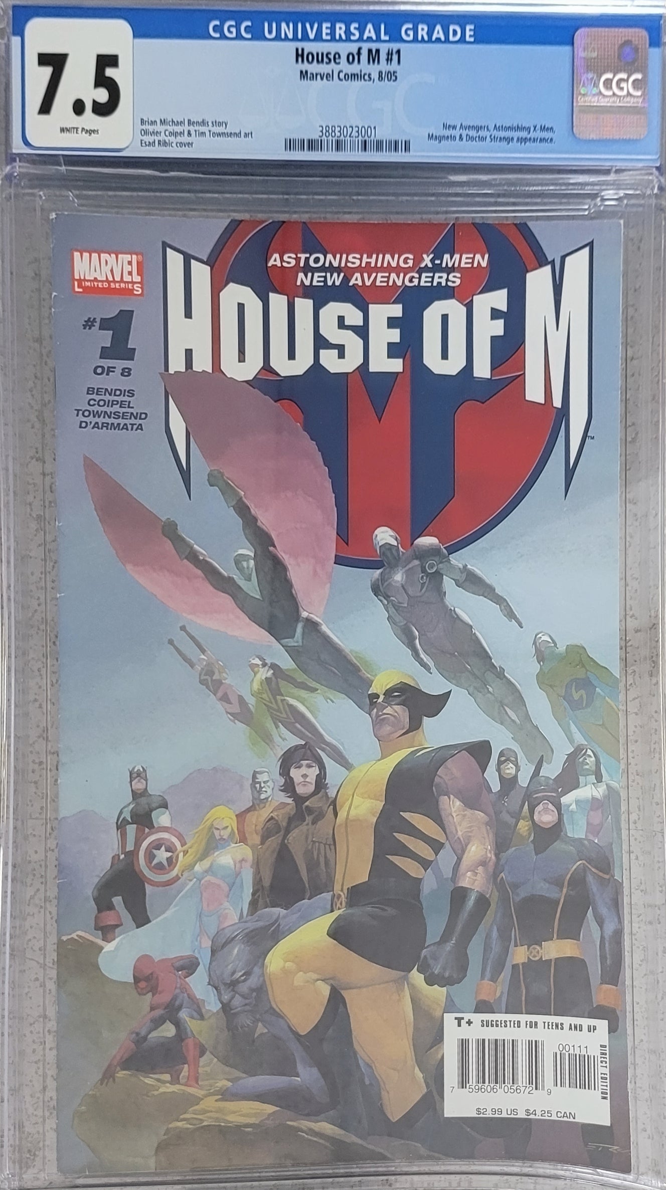 Written by BRIAN MICHAEL BENDIS. Pencils by OLIVIER COIPEL. Cover by Esad Ribic. HE MARVEL EVENT OF THE DECADE IS HERE!! The Avengers and the X-Men are faced with a common foe that becomes their greatest threat: Wanda Maximoff! The Scarlet Witch is out of control and the fate of the entire world is in her hands. Will Magneto help his daughter or use her powers to his own benefit? Starring the Astonishing X-Men and the New Avengers!! You know how sometimes you hear the phrase: AND NOTHING WILL EVER BE THE SAME AGAIN? Well, this time believe it, buster!! NOTHING WILL EVER BE THE SAME AGAIN! 32 PGS./T+ Suggested for Teens and Up ...$2.99 please note: Each issue of house of m will have a special variant cover. Cover price $2.99.